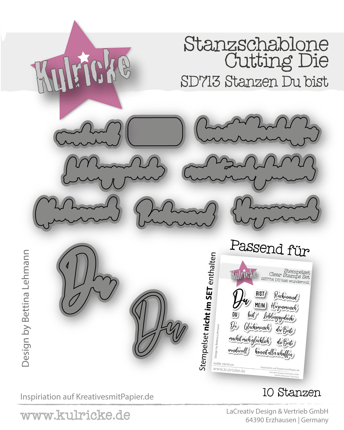 Mit dem Stanzenset „Du bist Wundervoll“ von Kulricke bringst du liebevolle Botschaften im Handumdrehen auf unsere Pralienenschachteln CD930, Karten, Verpackungen, Scrapbook-Seiten und vieles mehr. Das Set enthält 10 hochwertige Stanzschablonen, die perfekt auf das separat erhältliche Stempelset „Du bist wundervoll“ (SST713) abgestimmt sind.